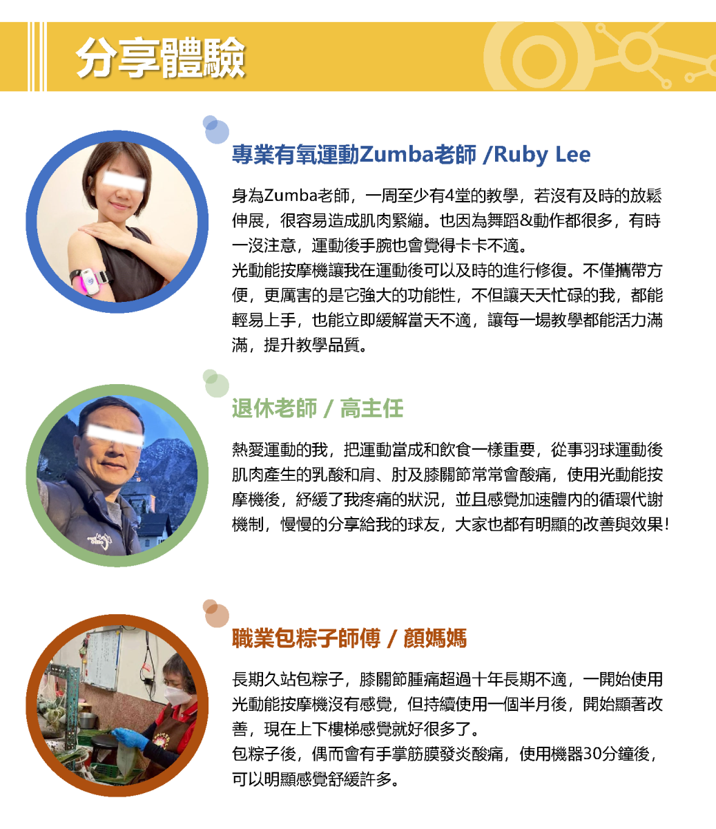 | !! 特殊人群使用須知 | 一、配戴心律調節器 : 禁止使用本產品,因為可能會干擾心律調節器的性能。 二、孕婦、癌症患者 : 若使用本產品,請諮詢醫師。 三、三高等慢性病患 : 可以用,若有疑慮請諮詢醫師指示。 四、糖尿病 : 可以用,若有疑慮請諮詢醫師指示。 五、小孩子 : 可以用,但建議使用在三歲以上的小孩子。 |