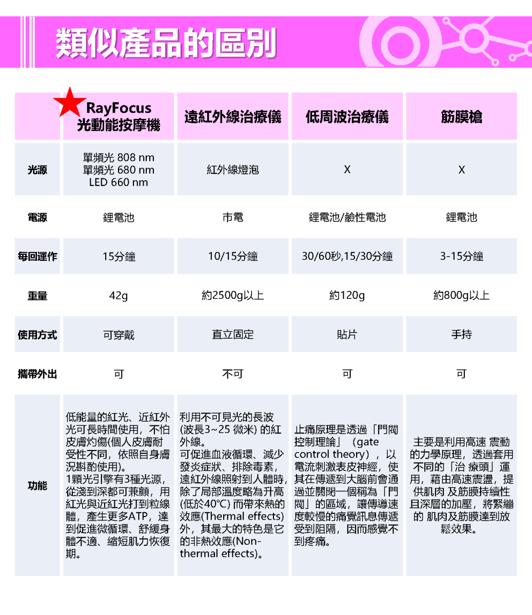 | 貼著皮膚 | 一定要貼著皮膚嗎? | 盡可能貼著皮膚,因為光的能量離皮膚越遠效果越差 (光能量與距離的平方成反比) |