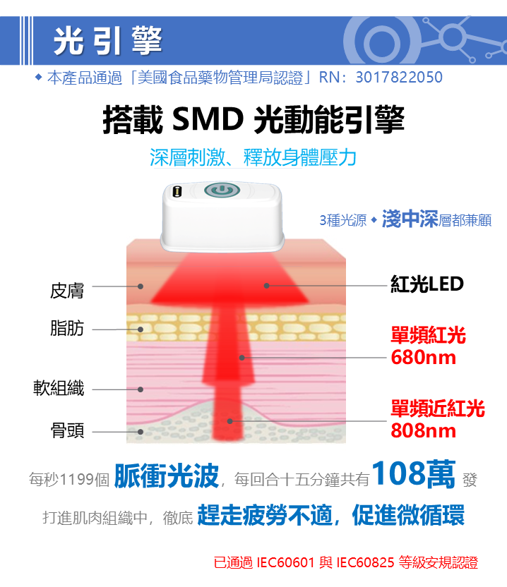 ⚡每秒1199個脈衝光波⚡:每回合十五分鐘共有108萬發脈衝光波打進肌膚中,為辛勞的您徹底趕走不適感。